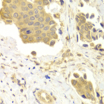 Immunohistochemistry of paraffin-embedded mammary cancer(hu) using GABARAP antibody at dilution of 1:100 (x40 lens).