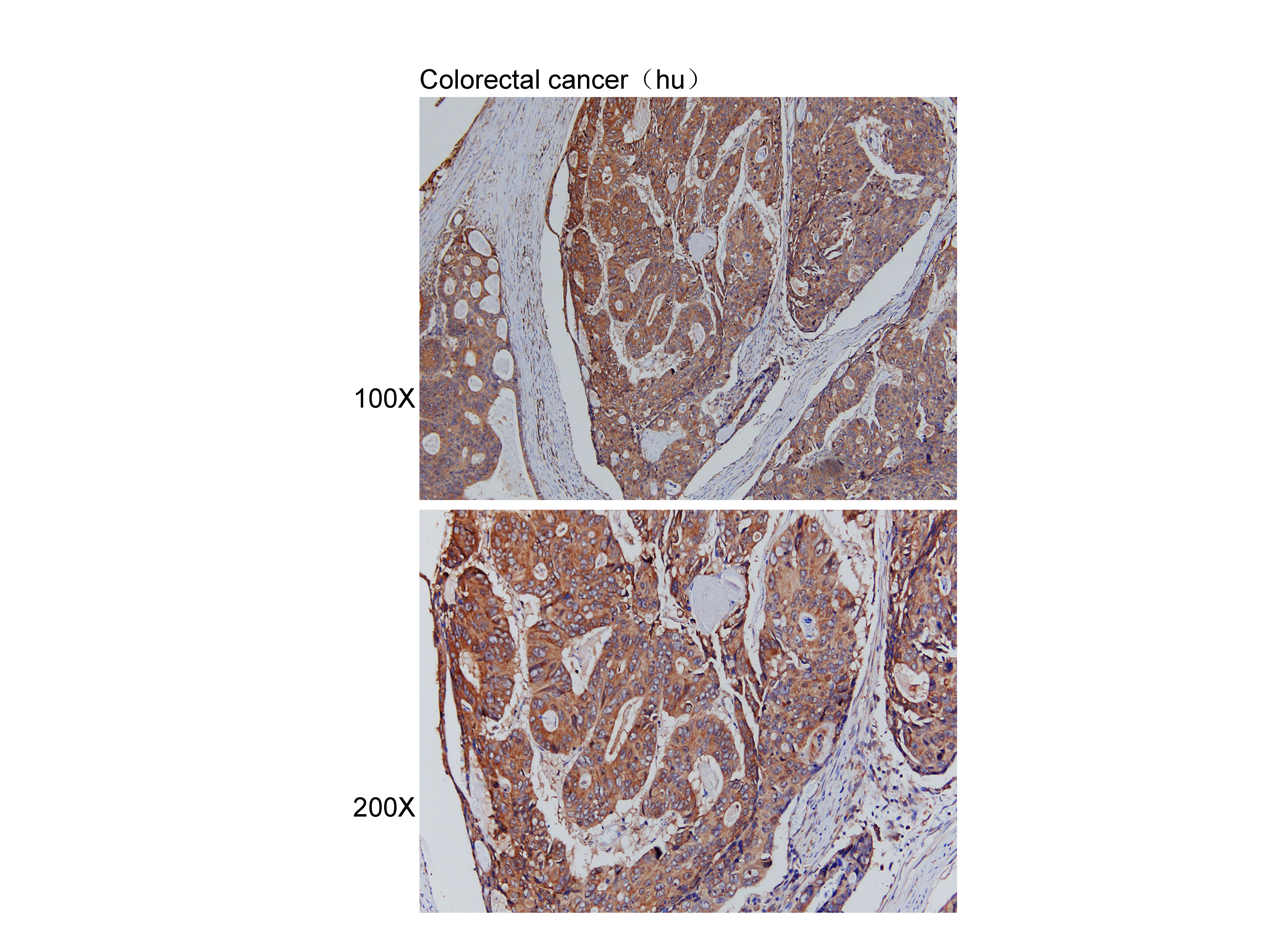 Immunohistochemistry of paraffin-embedded colorectal cancer��hu�� using FGFR2 antibody at dilution of 1:100 (x100 lens,x200 lens).