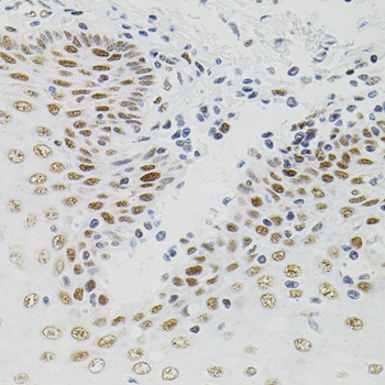 Immunohistochemistry of paraffin-embedded esophagus(hu) using AKAP8 antibody at dilution of 1:150.
