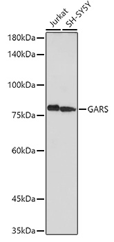 Western blot analysis with GARS antibody diluted at 1:1000;Lane:Jurkat,SH-SY5Y