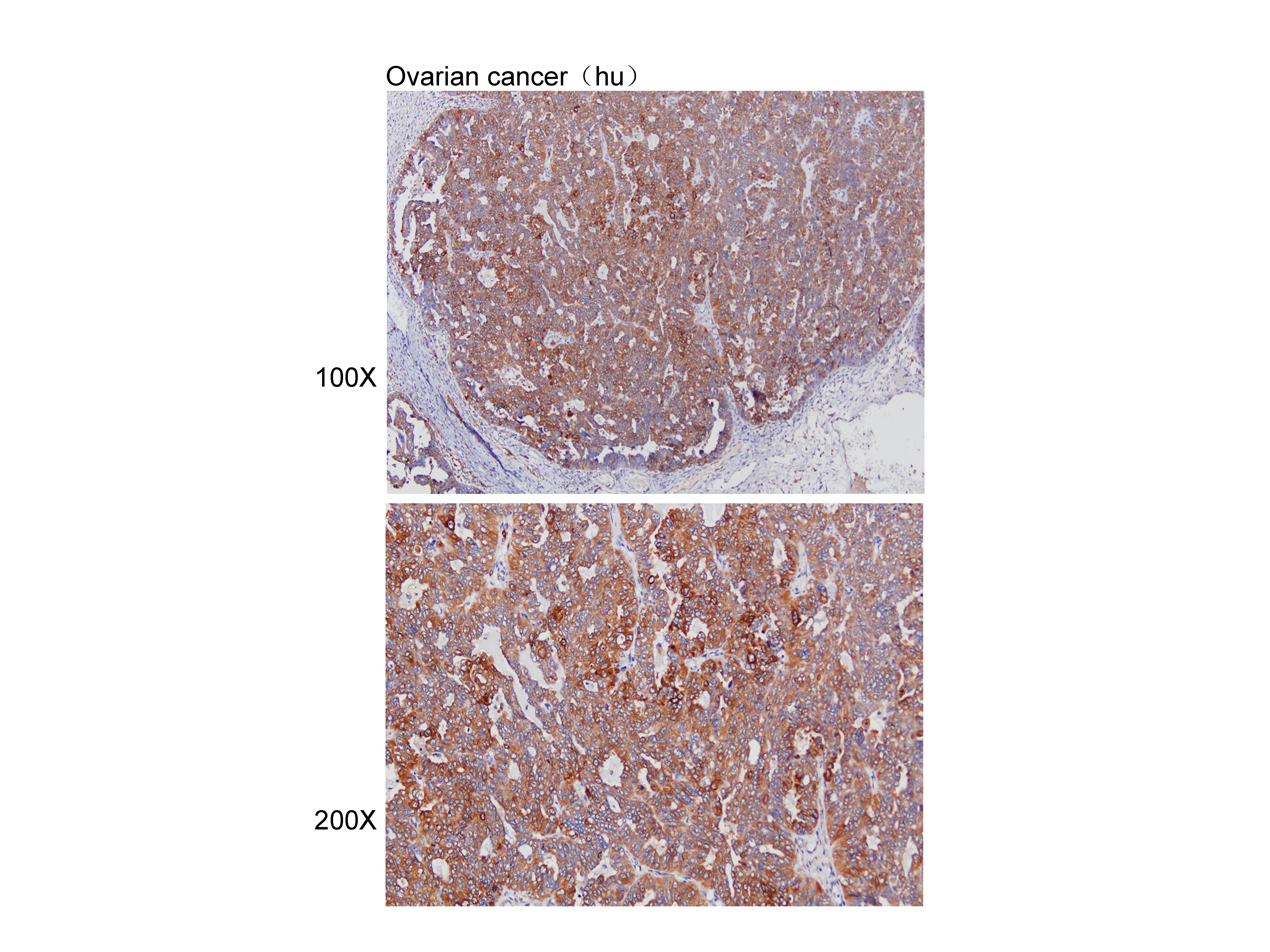 Immunohistochemistry of paraffin-embedded Ovarian cancer(hu) using PGRMC1 antibody at dilution of 1:100 (x100 lens,x200 lens).