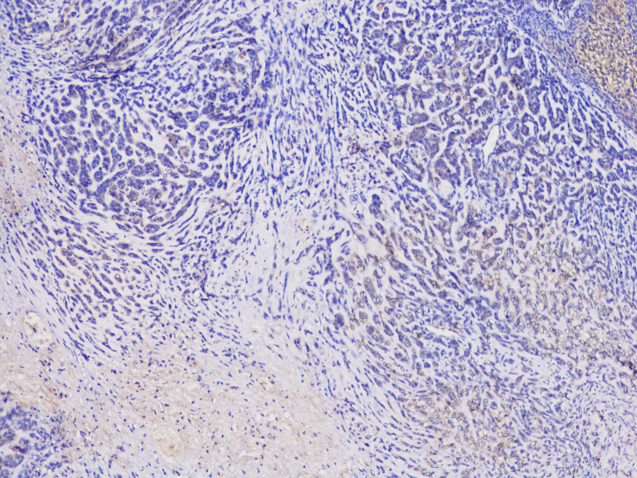 Immunohistochemistry of paraffin-embedded Lung cancer(hu) using TNFSF12 antibody at dilution of 1:100 (x100 lens).