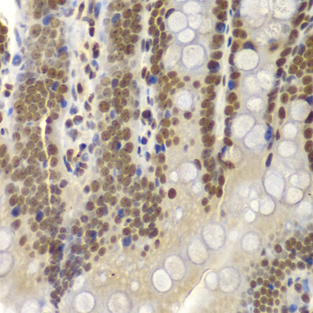 Immunohistochemistry of paraffin-embedded rat Intestine using SMARCB1 antibody at dilution of 1:200 (x40 lens).