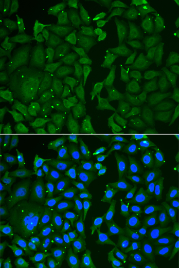 Immunofluorescence analysis of U2OS cell using TKT antibody. Blue: DAPI for nuclear staining.