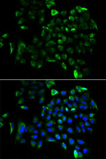 Immunofluorescence analysis of A549 cell using EEF1B2 antibody. Blue: DAPI for nuclear staining.