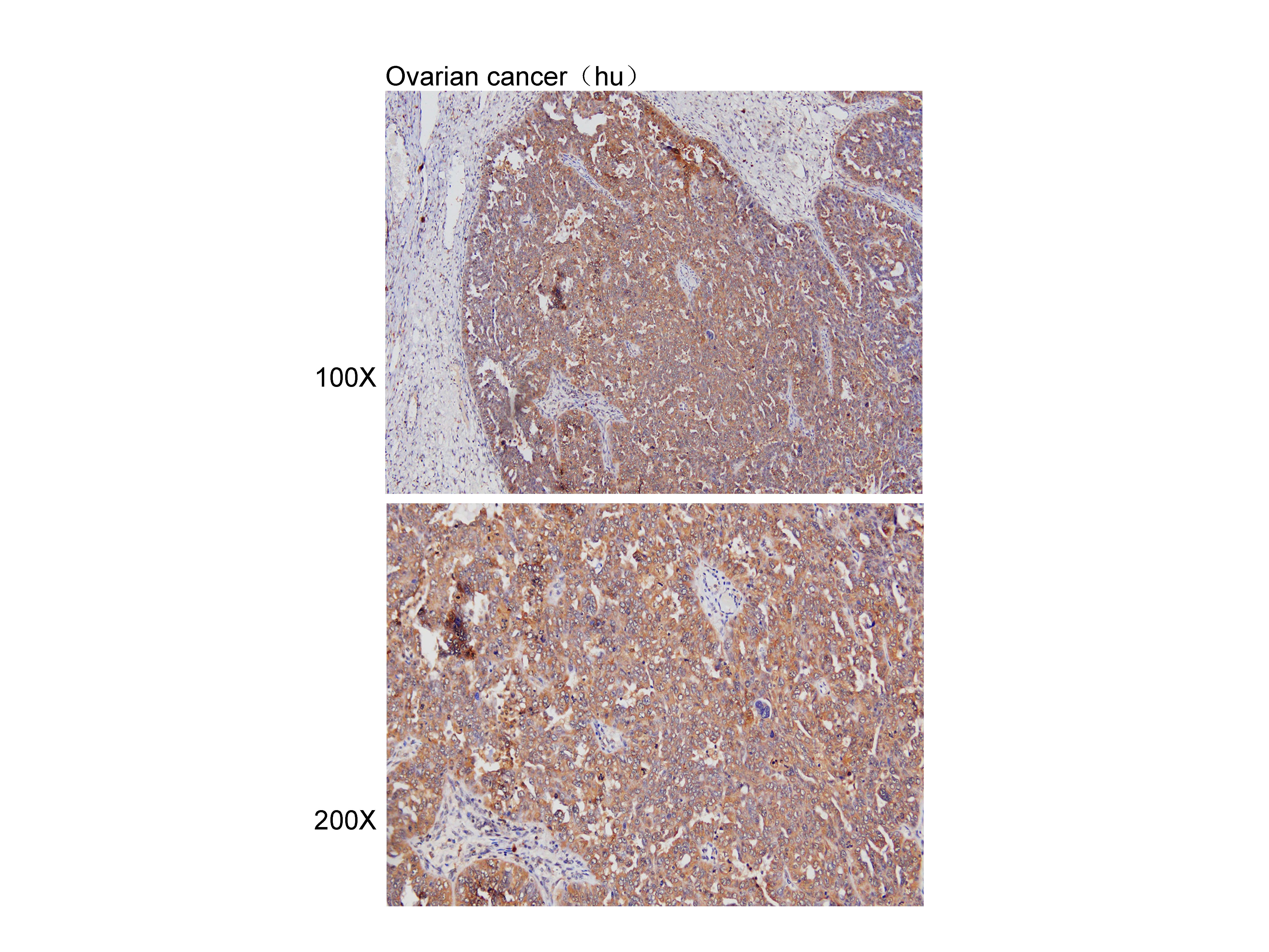 Immunohistochemistry of paraffin-embedded Ovarian cancer(hu) using PCMT1 antibody at dilution of 1:100 (x100 lens,x200 lens).