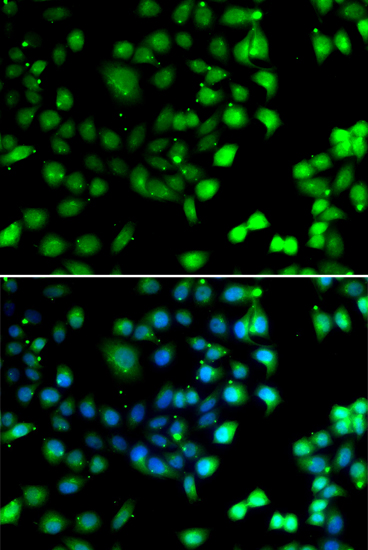 Immunofluorescence analysis of A549 cell using NTMT1 antibody. Blue: DAPI for nuclear staining.