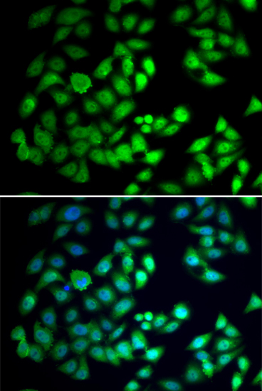 Immunofluorescence analysis of A549 cell using WDR77 antibody. Blue: DAPI for nuclear staining.