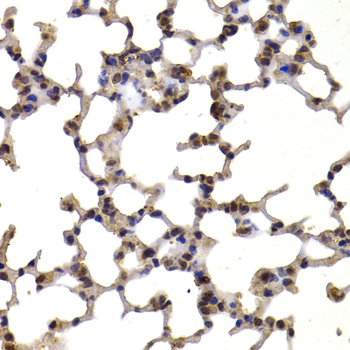 Immunohistochemistry of paraffin-embedded mouse lung using TXN antibody at dilution of 1:100 (x40 lens).