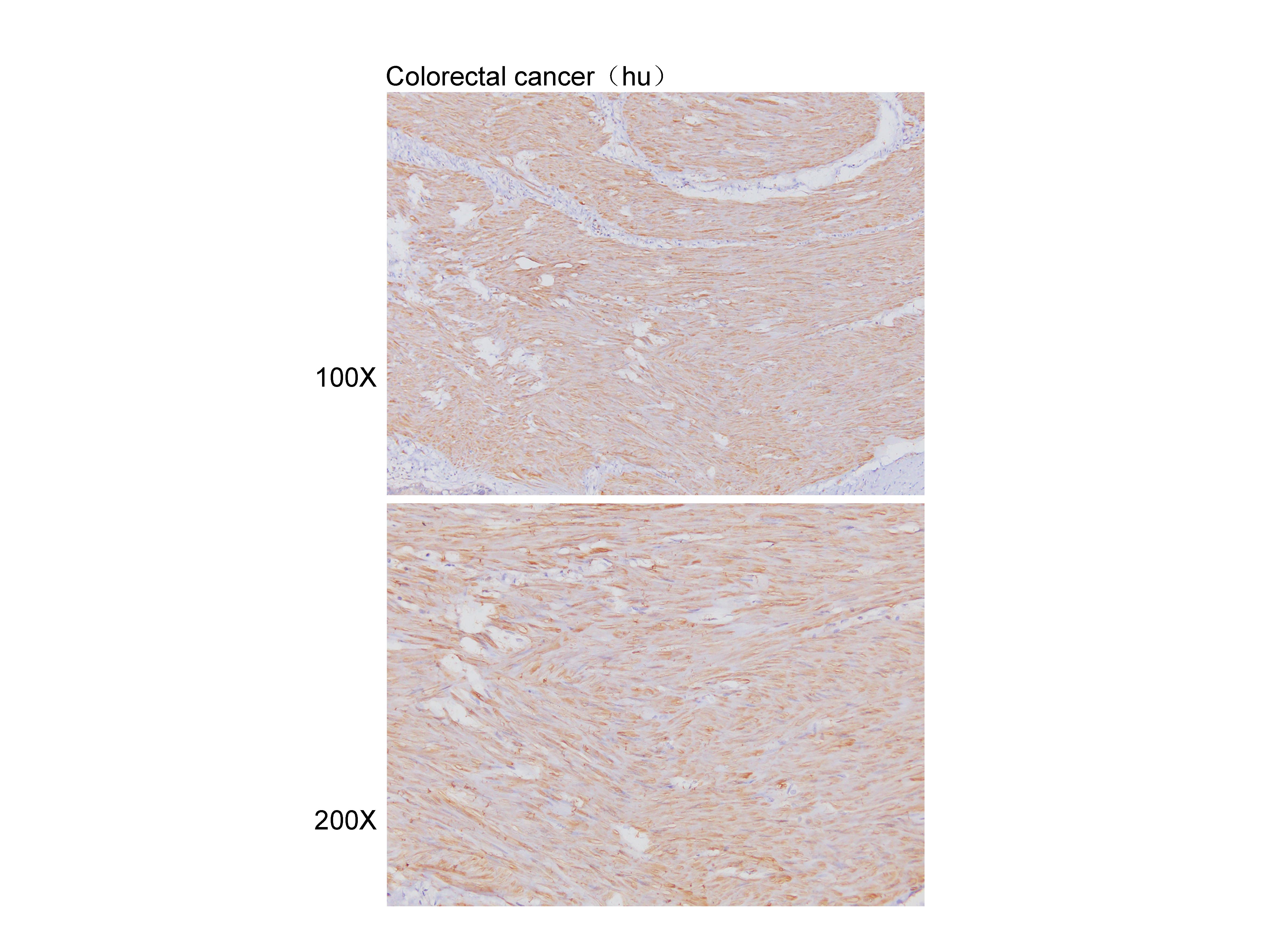 Immunohistochemistry of paraffin-embedded Colorectal cancer(hu) using MYLK antibody at dilution of 1:100 (x100 lens,x200 lens).
