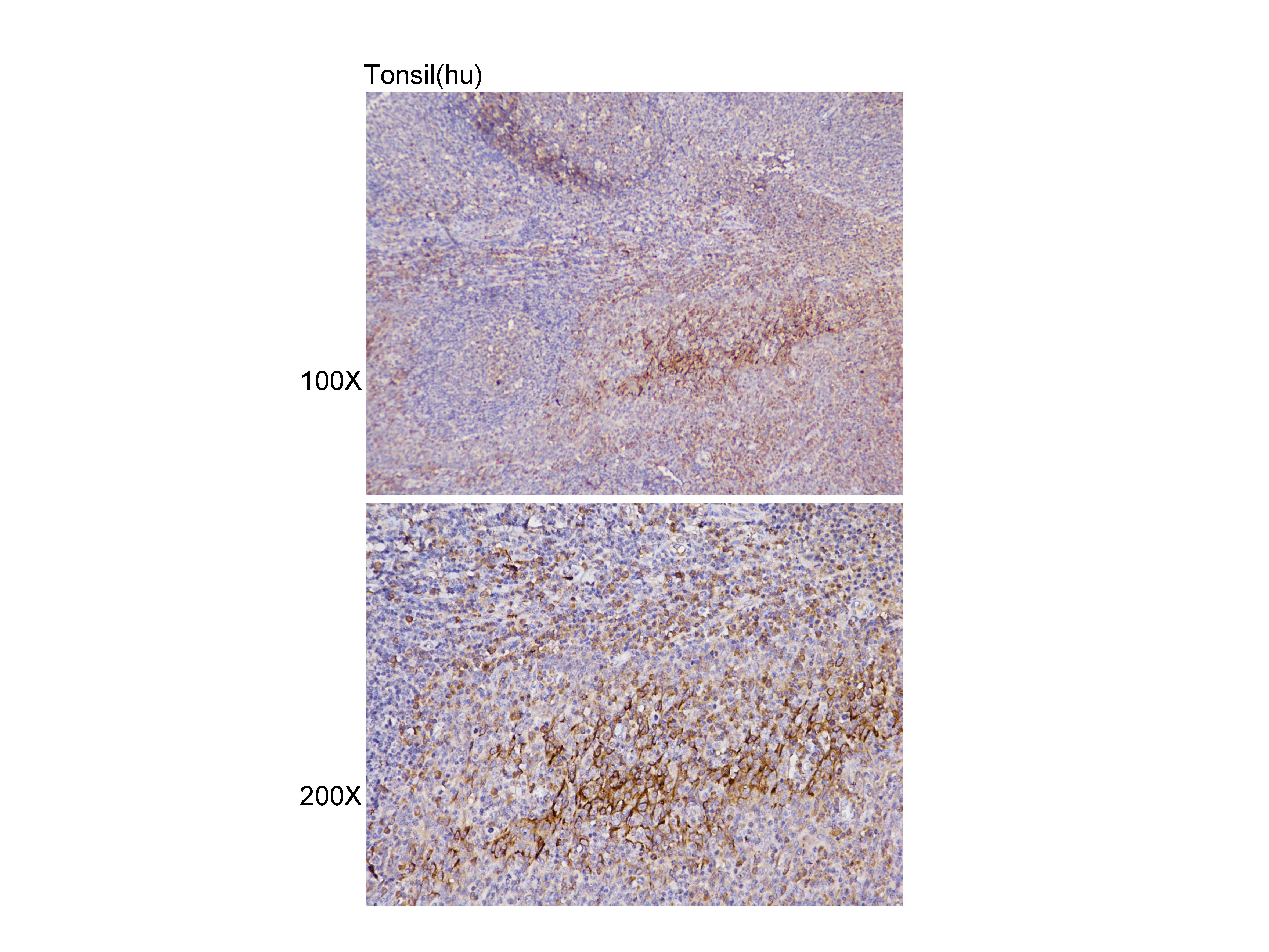 Immunohistochemistry of paraffin-embedded tonsil (hu) using TRPC6 antibody at dilution of 1:100 (x100 lens,x200 lens).