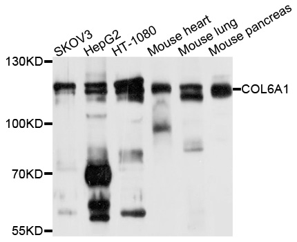 Western blot analysis with COL6A1 antibody diluted at 1:1000;Lane: SKOV3,HepG2,HT-1080,Mouse heart,Mouse lung,Mouse pancreas