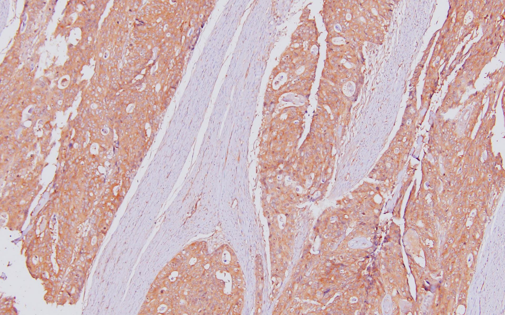 Immunohistochemistry of paraffin-embedded Colorectal cancer(hu) using CYFIP1 antibody at dilution of 1:100 (x100 lens).