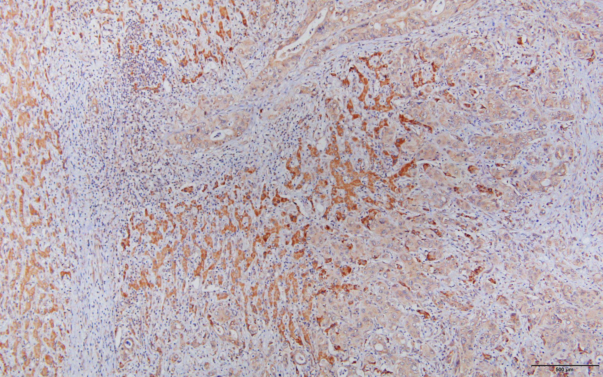 Immunohistochemistry of paraffin-embedded Liver cancer(hu) using C7 antibody at dilution of 1:100 (x100 lens).