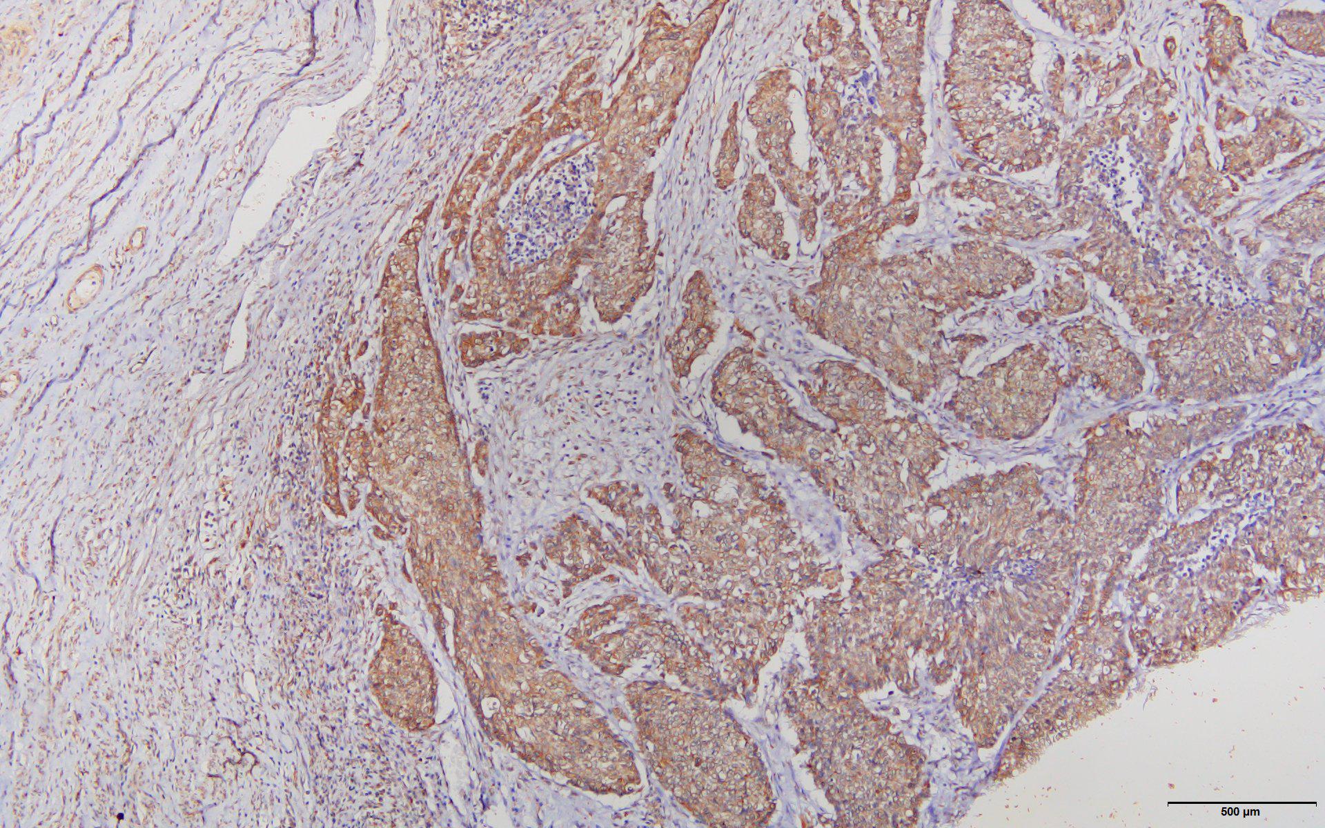 Immunohistochemistry of paraffin-embedded Cervical cancer(hu) using C7 antibody at dilution of 1:100 (x100 lens).