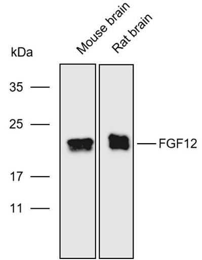 Western blot analysis with FGF12 antibody diluted at 1:1000; Lane : Mouse brain,Rat brain