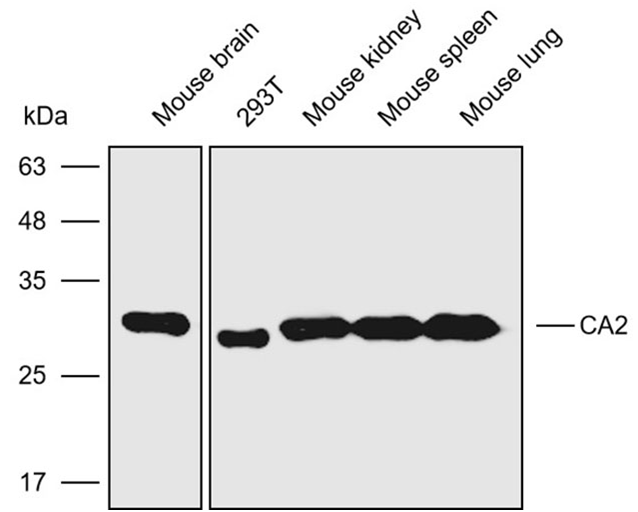 Western blot analysis with CA2antibody diluted at 1:3000; Lane : Mouse brain,293T,Mouse kidney,Mouse spleen,Mouse lung