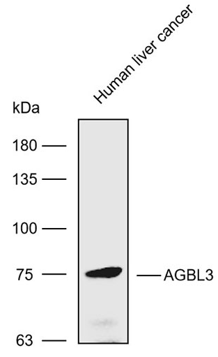 Western blot analysis with AGBL3 antibody diluted at 1:250; Lane : Human liver cancer