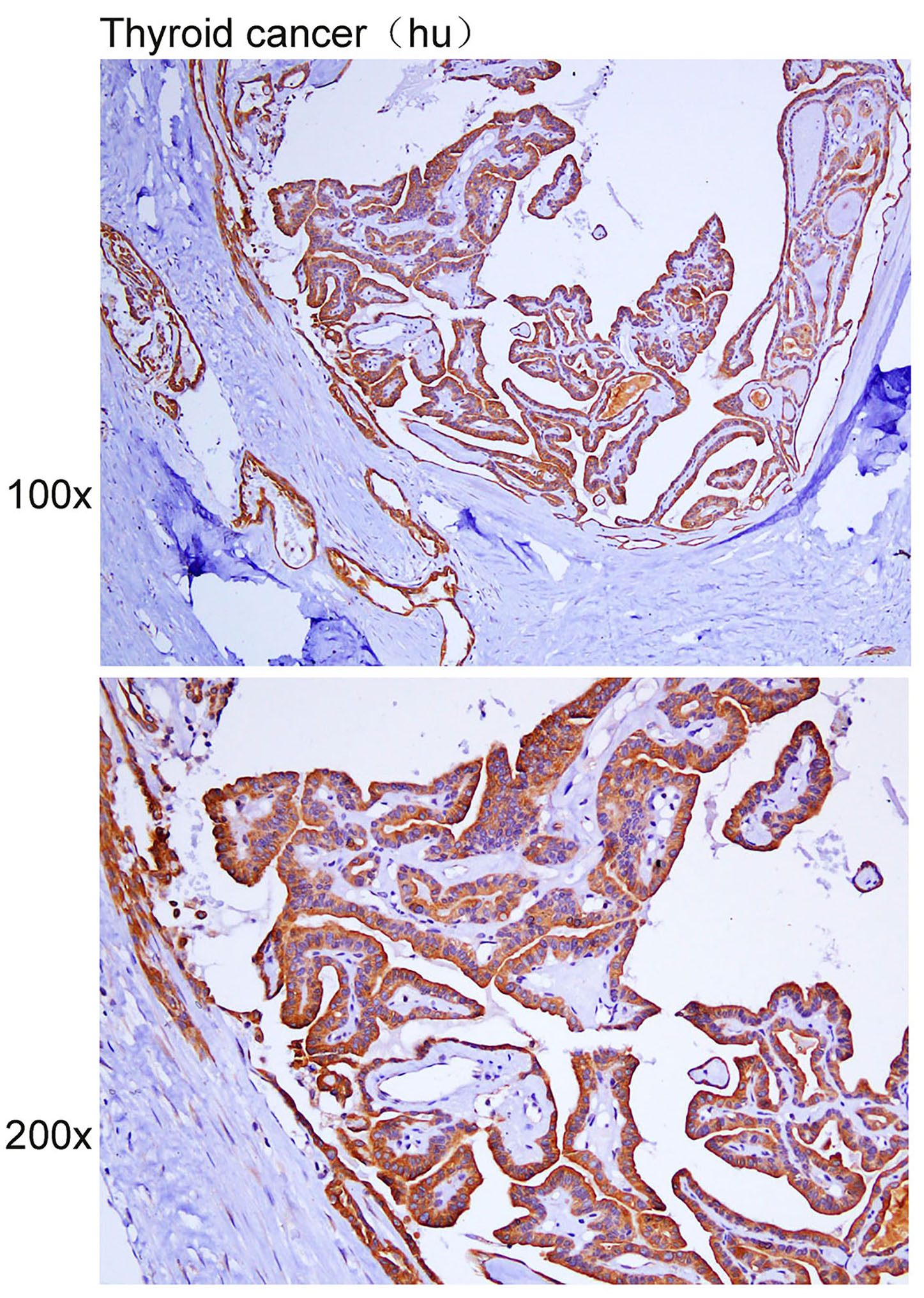 Immunohistochemistry of paraffin-embedded human thyroid cancer tissue with CHI3L1 antibody diluted at 1:25
