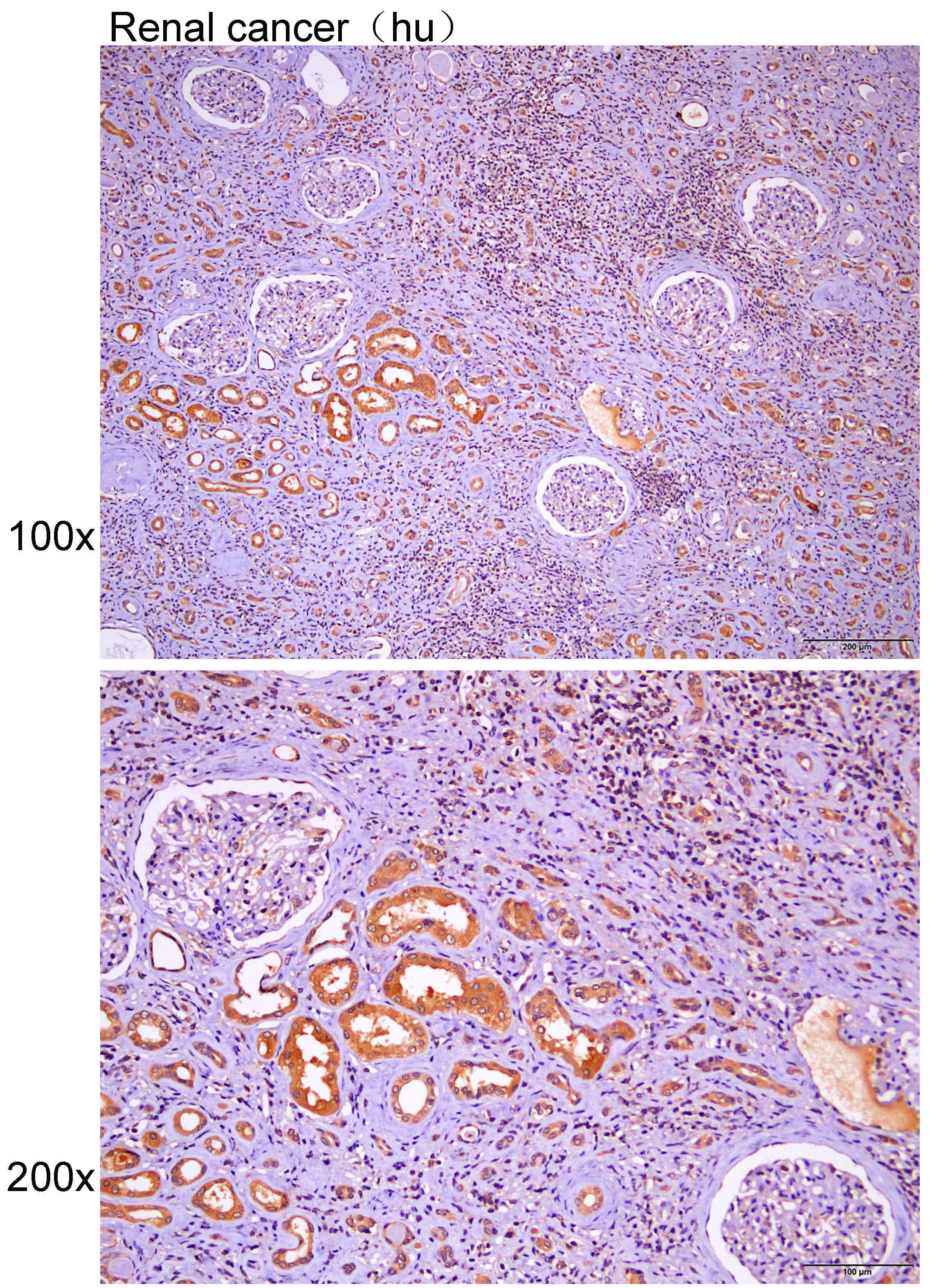 Immunohistochemistry of paraffin-embedded Hhuman renal cancer tissue with CNNM3 antibody diluted at 1:25