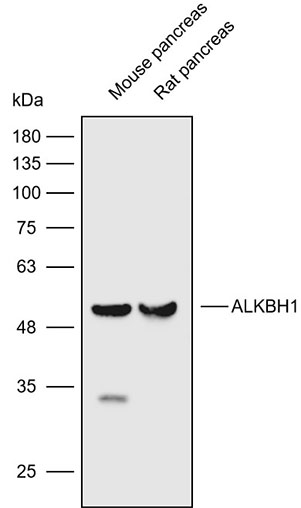 Western blot analysis with ALKBH1 antibody diluted at 1:1000;Lane: Mouse pancreas,Rat pancreas