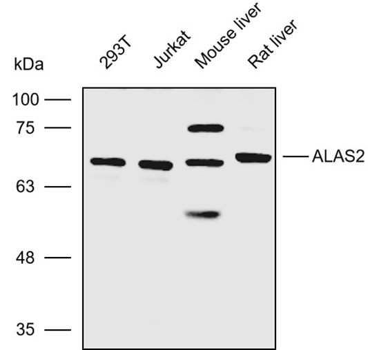 Western blot analysis with ALAS2 antibody diluted at 1:1000; Lane : 293T,Jurkat,Mouse liver,Rat liver