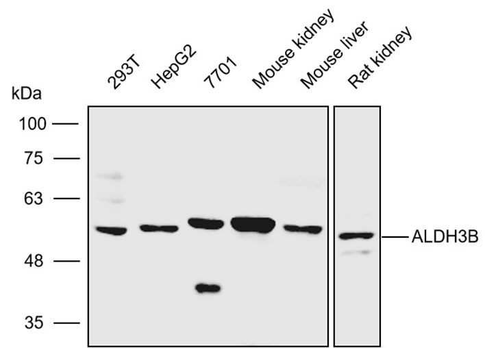 Western blot analysis with ALDH3B1 antibody diluted at 1:500; Lane : 293T,HepG2,7701,Mouse kidney,Mouse liver,Rat kidney
