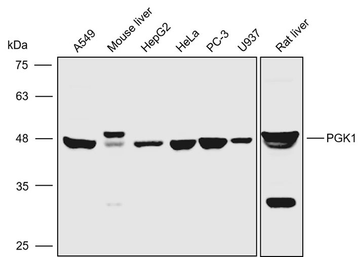 Western blot analysis with PGK1 antibody diluted at 1:3000; Lane : A549,Mouse liver,HepG2,HeLa,PC-3,U937,Rat liver