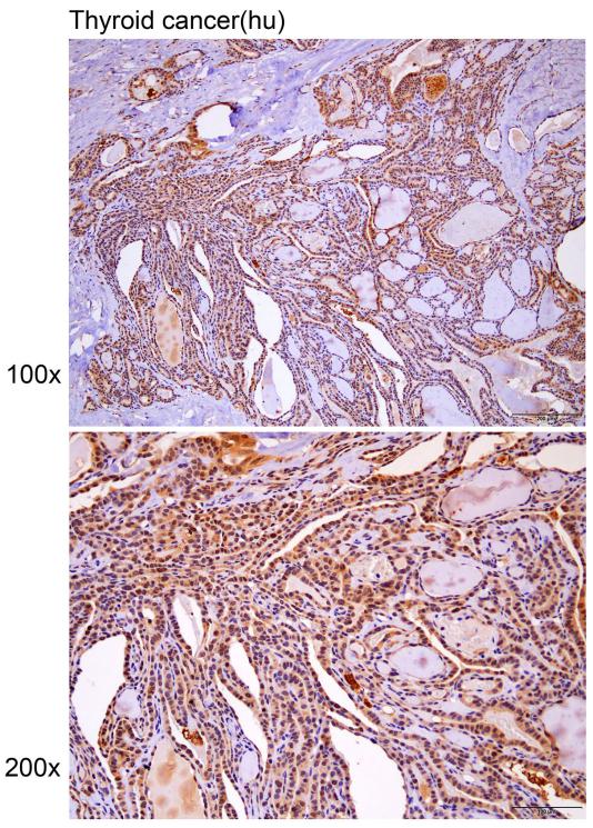 Immunohistochemistry of paraffin-embedded Human thyroid cancer with ARMCX2 antibody diluted at 1:25
