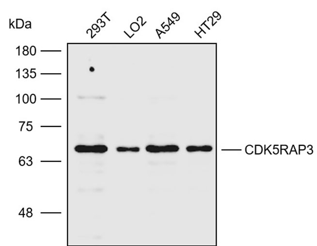 Western blot analysis with CDK5RAP3 antibody diluted at 1:500; Lane: 293T,LO2,A549,HT29