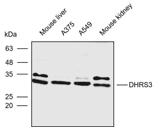 Western blot analysis with DHRS3 antibody diluted at 1:1000; Lane: Mouse liver,A375,A549,Mouse kidney