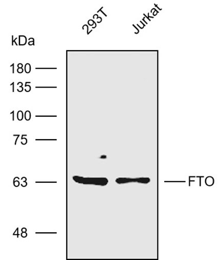 Western blot analysis with FTO antibody diluted at 1:1000; Lane: 293T,Jurkat