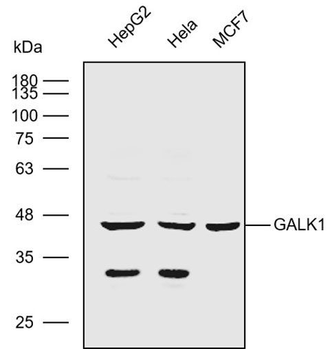 Western blot analysis with GALK1 antibody diluted at 1:1000; Lane: HepG2,Hela,MCF7