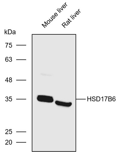 Western blot analysis with HSD17B6 antibody diluted at 1:500; Lane: Mouse liver,Rat liver
