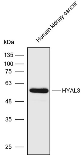 Western blot analysis with HYAL3 antibody diluted at 1:500; Lane : Human kidney cancer