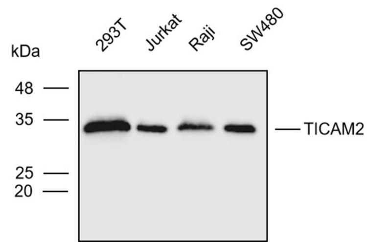 Western blot analysis with TICAM2 antibody diluted at 1:500; Lane : 293T,Jurkat,Raji,SW480