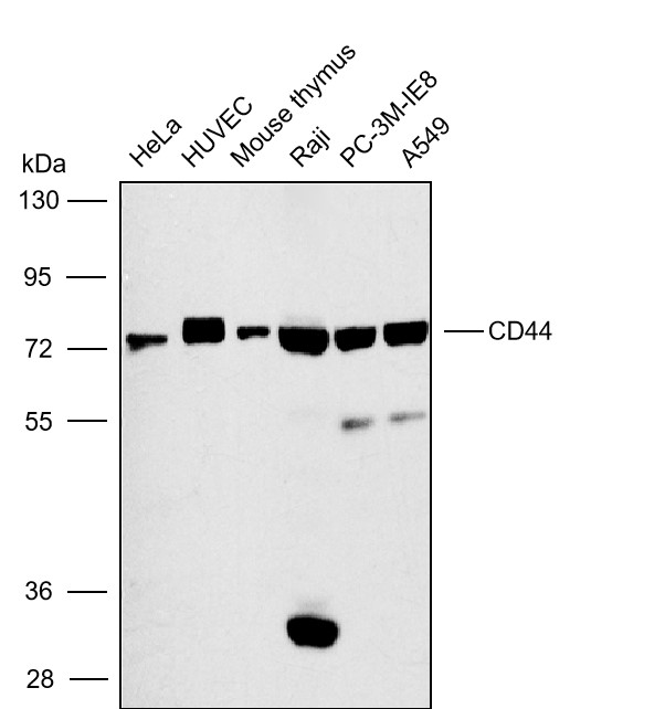 Western blot analysis with CD44 antibody diluted at 1:800;Lane:HeLa,HUVEC,Mouse thymus,Raji,PC-3M-IE8,A549