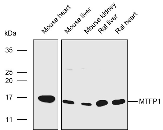 Western blot analysis with MTFP1 antibody diluted at 1:1000; Lane : Mouse heart,Mouse liver,Mouse kidney,Rat liver,Rat heart