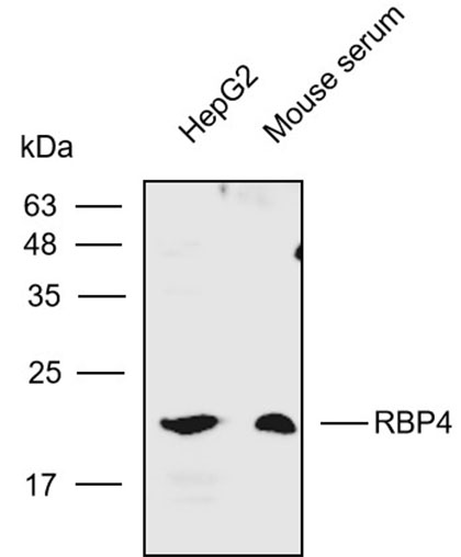 Western blot analysis with RBP4 antibody diluted at 1:500; Lane: HepG2,Mouse serum