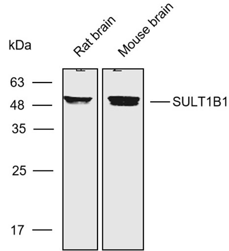 Western blot analysis with SULT1B1 antibody diluted at 1:3000; Lane: Rat brain,Mouse brain