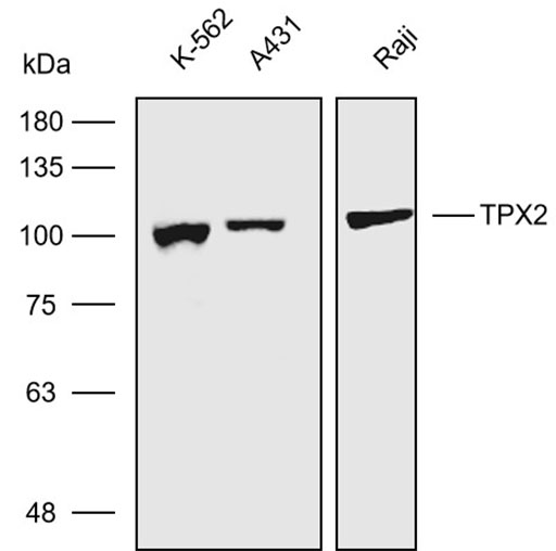 Western blot analysis with TPX2 antibody diluted at 1:1000; Lane:K-562,A431,Raji