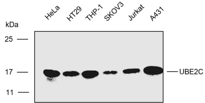 Western blot analysis with UBE2C antibody diluted at 1:500; Lane : HeLa,HT29,THP-1,SKOV3,Jurkat,A431