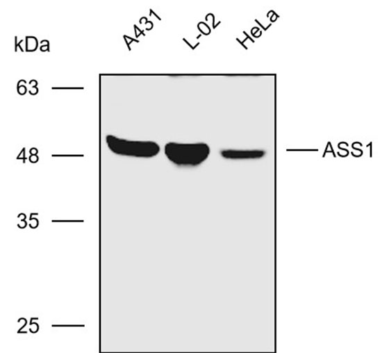 Western blot analysis with ASS1 antibody diluted at 1:1000; Lane: A431,L-02,Hela