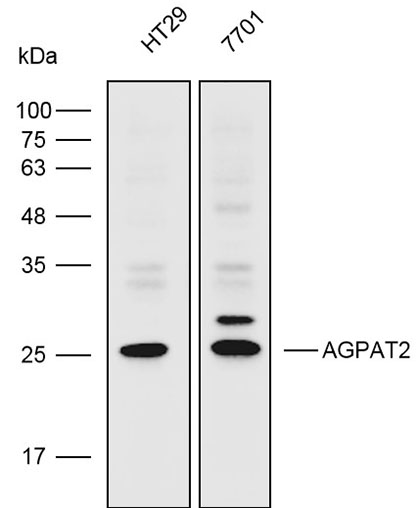 Western blot analysis with AGPAT2 antibody diluted at 1:1000; Lane: HT29,7701