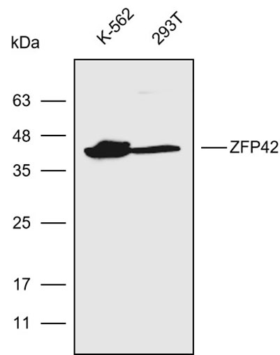 Western blot analysis with ZFP42 antibody diluted at 1:1000; Lane : K-562,293T