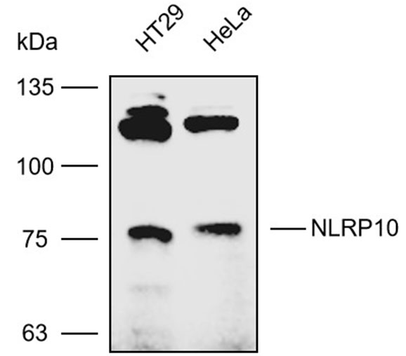 Western blot analysis with NLRP10 antibody diluted at 1:300;Lane: HT29,HeLa