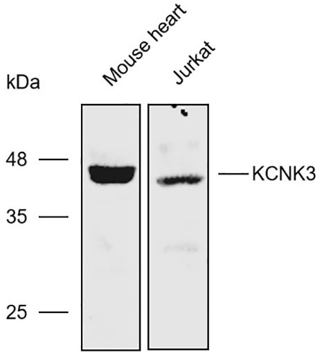 Western blot analysis with KCNK3antibody diluted at 1:1000;Lane:Mouse heart,Jurkat