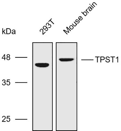 Western blot analysis with TPST1 antibody diluted at 1:500; Lane:293T,Mouse brain