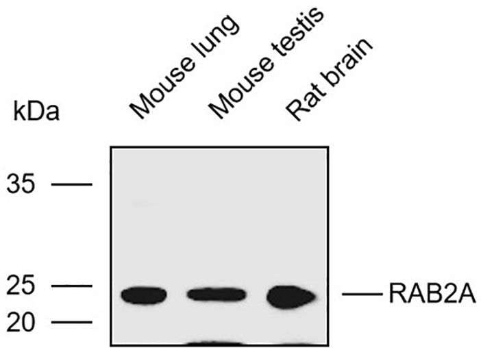 Western blot analysis with RAB2A antibody diluted at 1:1000; Lane:Mouse lung,Mouse testis,Rat brain
