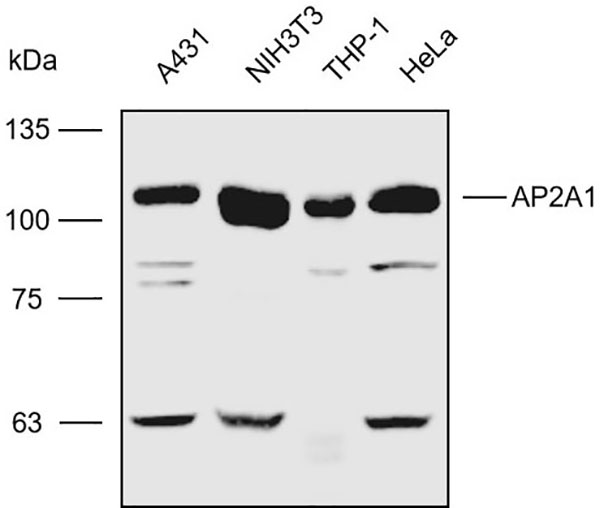 Western blot analysis with AP2A1 antibody diluted at1:1000;Lane :A431,NIH3T3,THP-1,HeLa